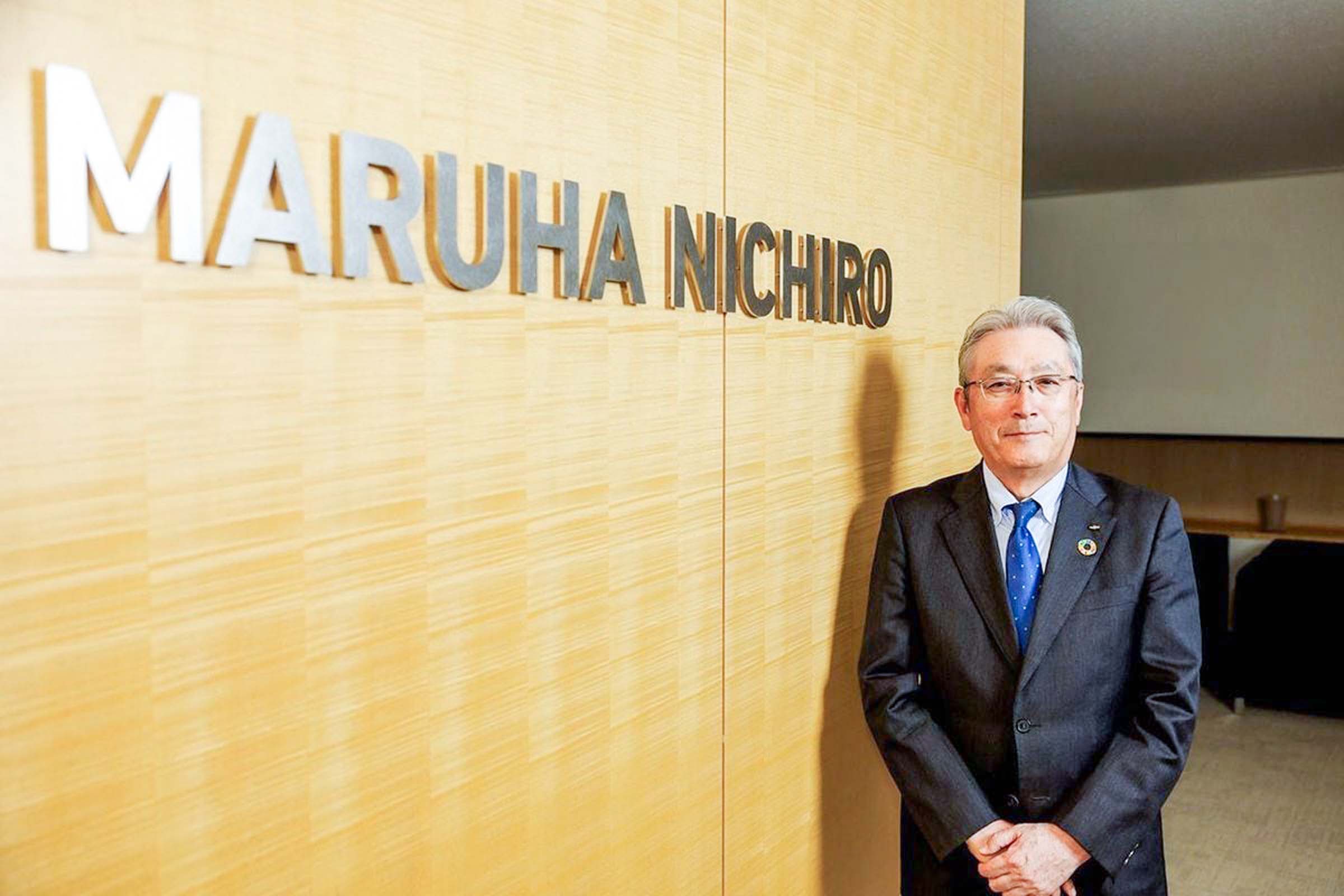 Se nøye på dette bildet. Neste år står det ikke lenger Maruha Nichiro på skiltet ved siden av konsernsjef Masaru Ikemi, som har ledet verdens største sjømatselskap siden april 2020. Da står det Umios. (Foto: Maruha Nichiro)