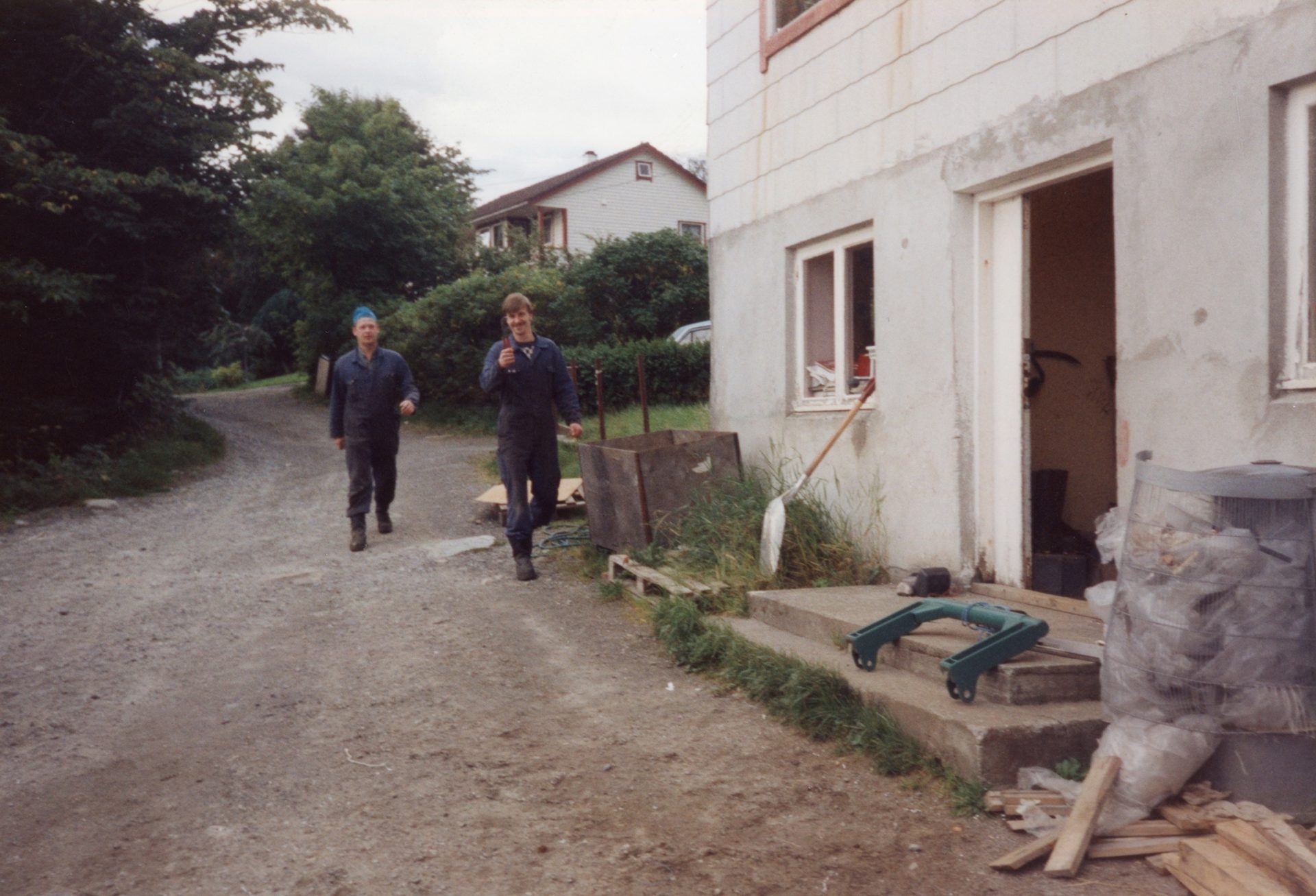 Det startet i 1995 som en rørleggerbedrift på Stadlandet. Fra venstre Nils-Per og Arnfinn Sjåstad foran garasjen hvor de holdt til. I 2020 kom tyske SIMONA AG inn på eiersiden med 75 prosent av aksjene. Resten deles mellom brødrene Nils-Per og Kurt Sjåstad. (Foto: Privat)