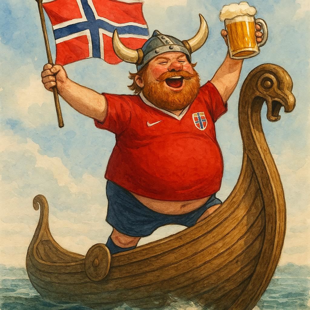Det var neppe slik det skjedde før. Og ikke riktig slik det skjer i dag. Men fotballkulturen forener forskjellige ting vi er stolte av. Og kanskje ikke fullt så stolte. Foto: Norsk Fiskerinæring/Bing Image Creator.