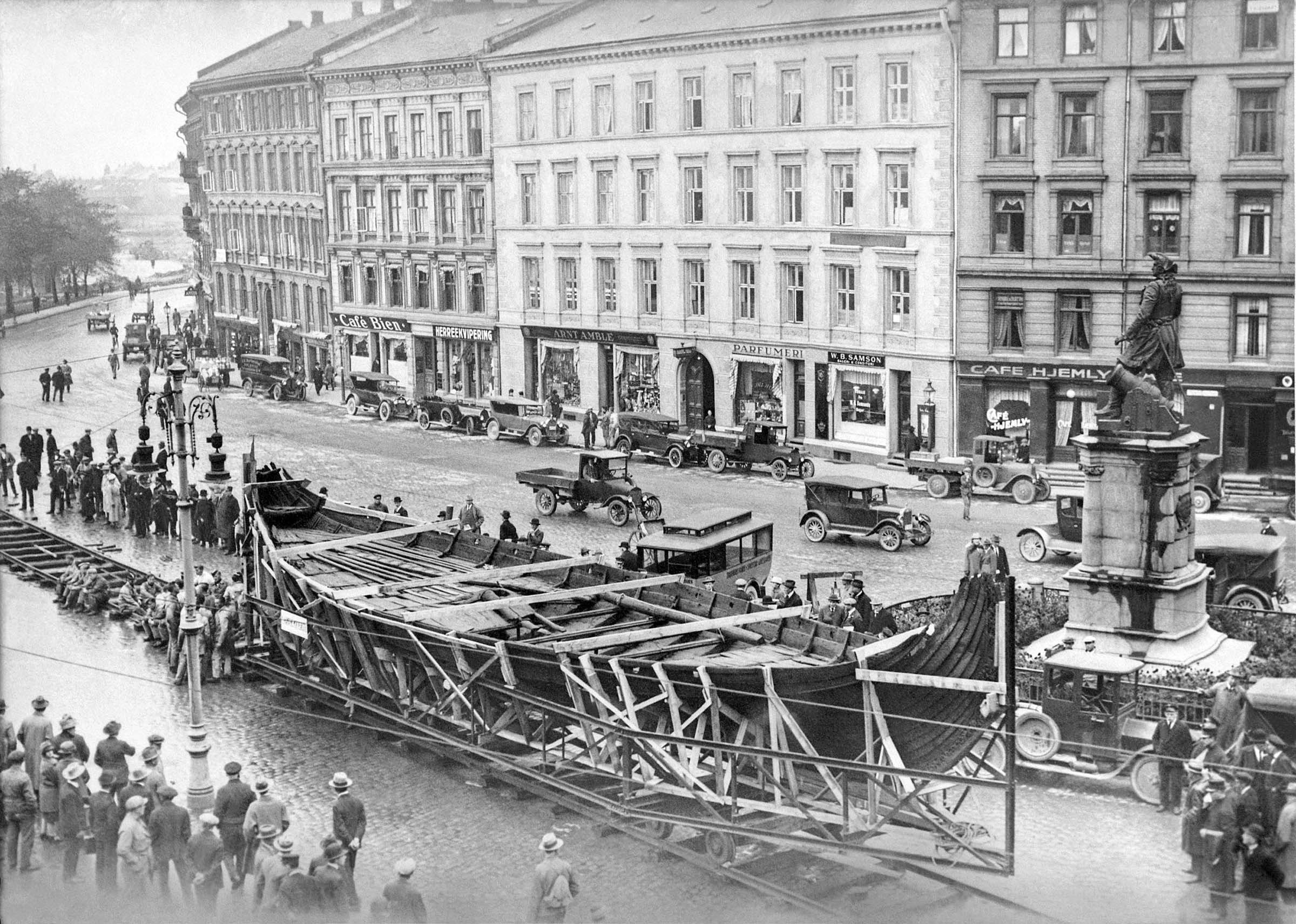 Osebergskipet har vært flyttet før, men mye billigere! Dette bildet ble tatt under flyttingen fra Kulturhistorisk museum til Vikingskipshuset i 1926. Det er noe annet i 2025. (Foto: KHM)