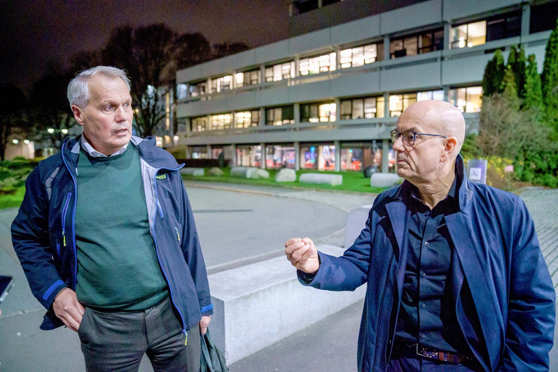 Vi har ingen bilder av Gustav Witzøe og Helge Møgster sammen. Det nærmeste vi kommer er dette av Witzøe og Helge Singelstad (t.h.), adm. direktør i Laco AS, Møgster-familiens holdingsselskap. (Foto: NTB)