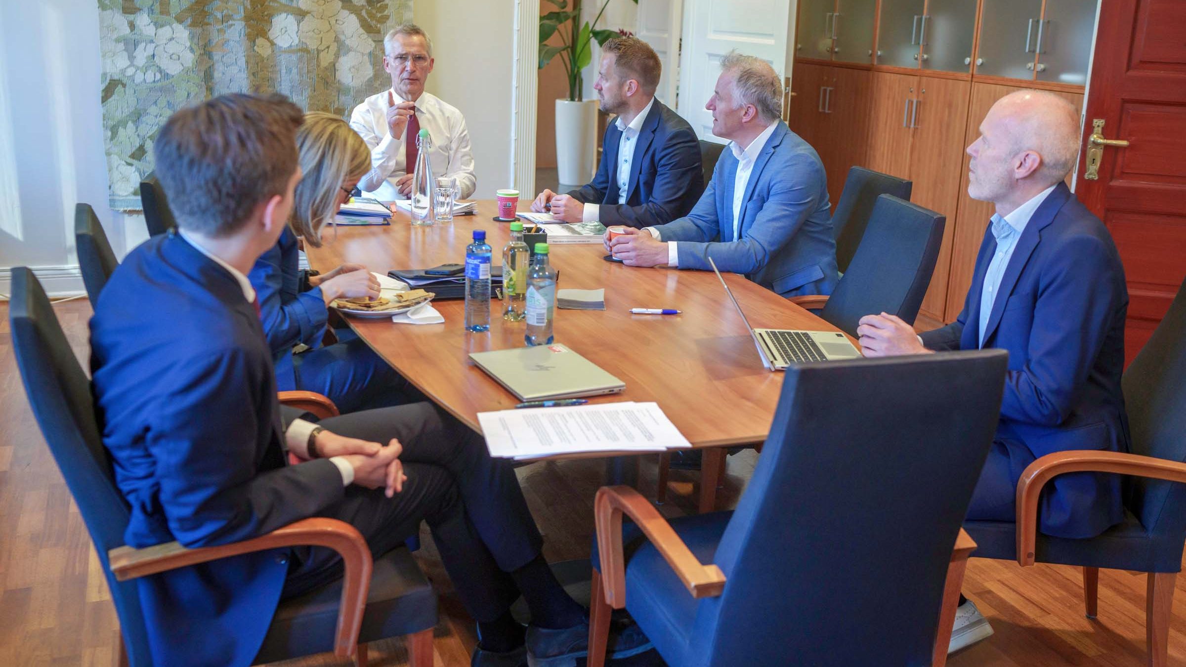 Det vil ikke forundre Dreyer det minste om det under stabsmøter i Finansdepartementet blir diskutert muligheten for å skattlegge kvoteporteføljene i fiskeflåten. Her fra et stabsmøte tidligere i år. Ved bordenden finansminister Jens Stoltenberg. (Foto: NTB)