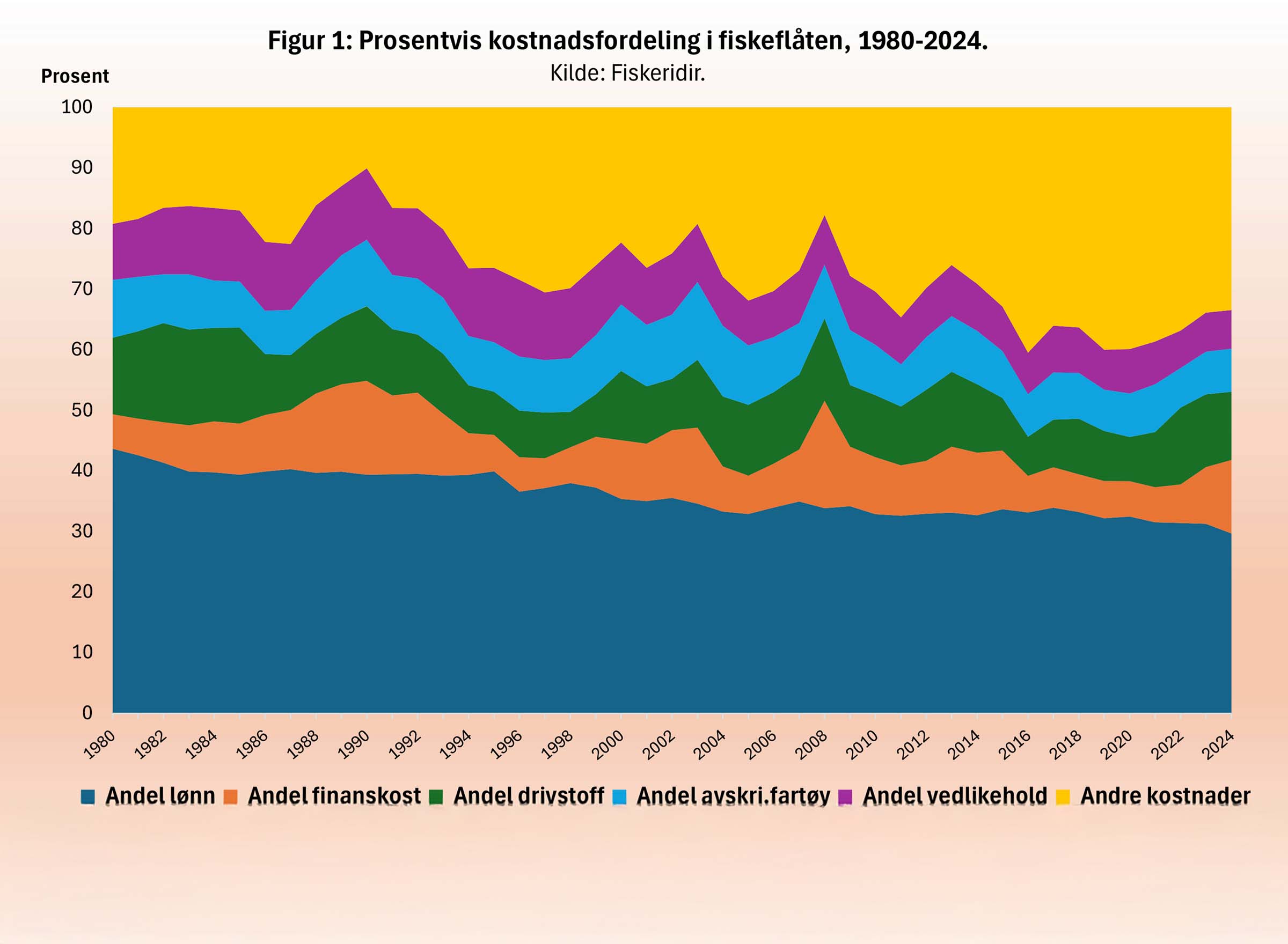 Vanligvis pleier vi å studere hvor stor andel de ulike utgiftspostene i et selskap utgjør av de totale kostnadene. I denne lille artikkelen skal vi se nærmere på hvilke andeler utgiftspostene i fiskeflåten utgjør av de totale inntektene, med andre ord av fangstverdien.