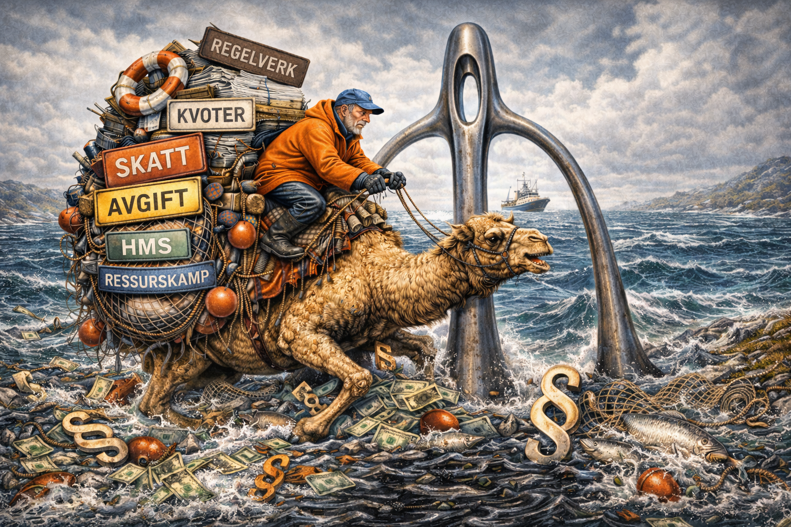 Fiskebåt organiserer havfiskeflåten og store kystfartøy. Styreleder Christian Halstensen i Fiskebåt hadde ikke så mye positivt å melde i årsmøtes åpningstale. (Ill. chatgpt/Tande)