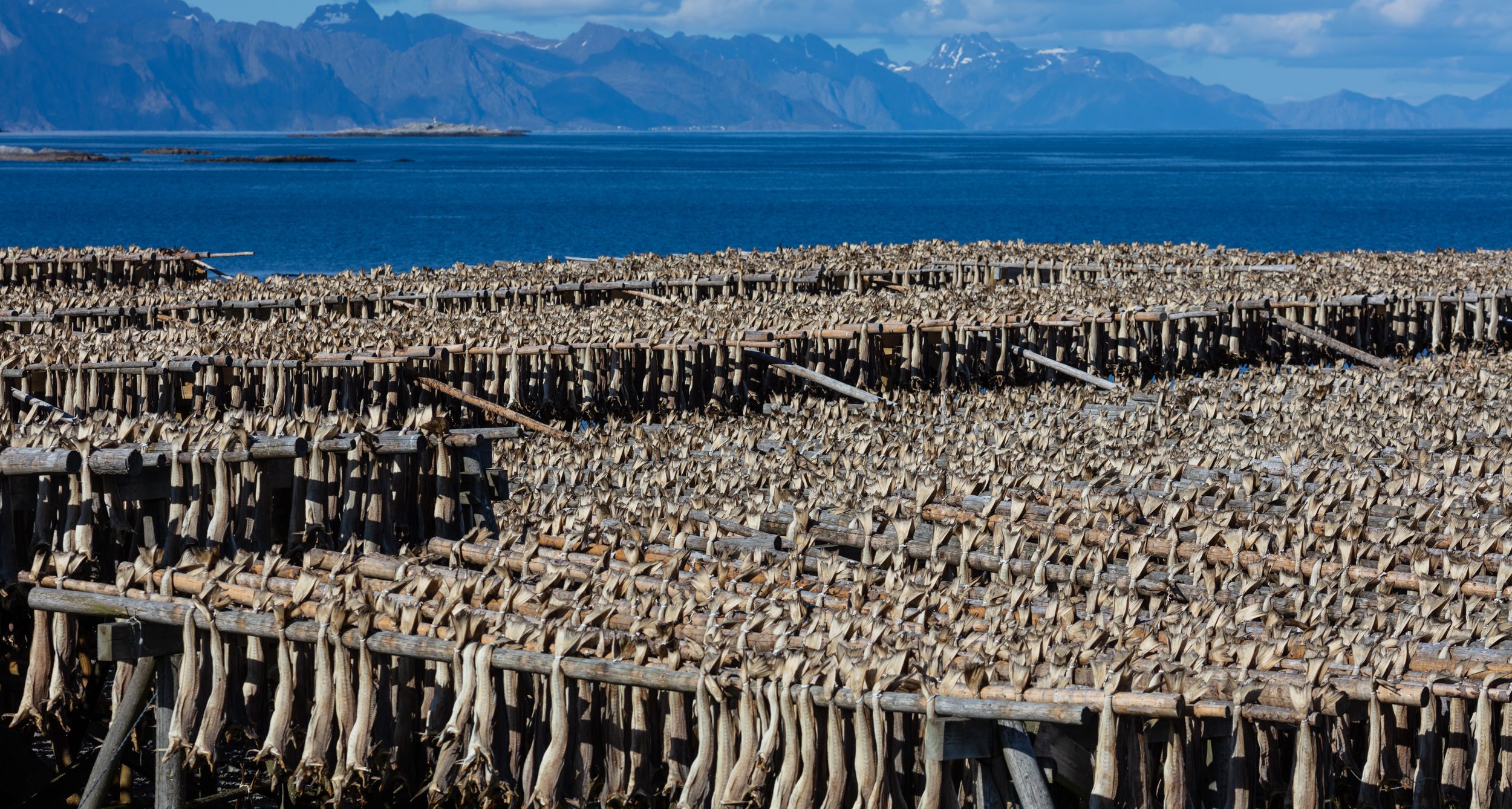 Riktig tørket og lagret kan tørrfisk holde i årevis. Det krever verken strøm eller emballasje og har svært høyt proteininnhold. Tørrfiskhjeller på Værøy med Lofotveggen bak. (Foto: Tørrfisk fra Lofoten AS)