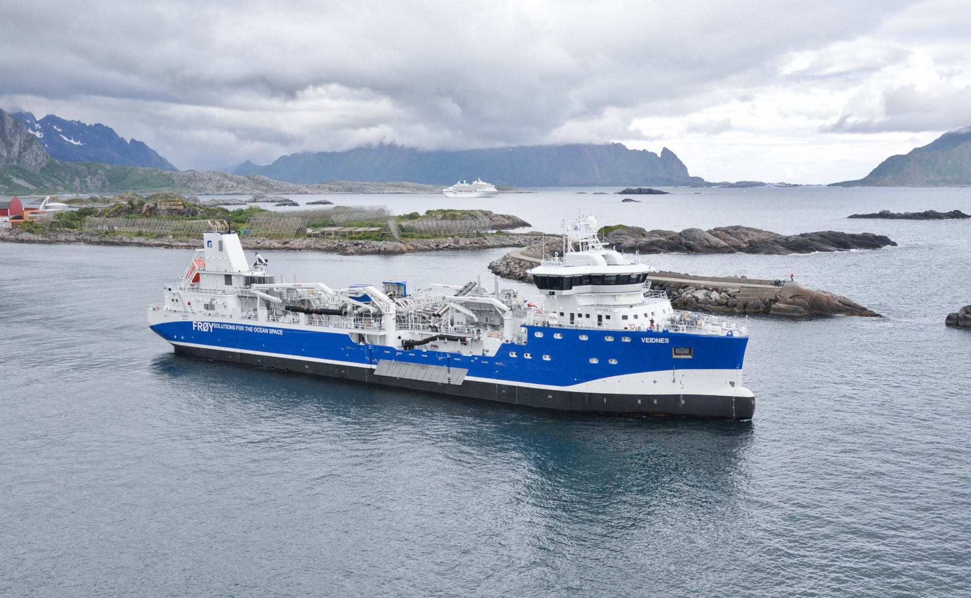 Cermaq Norge AS eier ingen egne brønnbåter, men har faste avtaler med flere. En av dem er 119 meter lange «Veidnes» til Frøy (bildet), som ble døpt i Hammerfest i juni i fjor. Månedens intervjuobjekt var gudmor! (Foto: Arkiv)