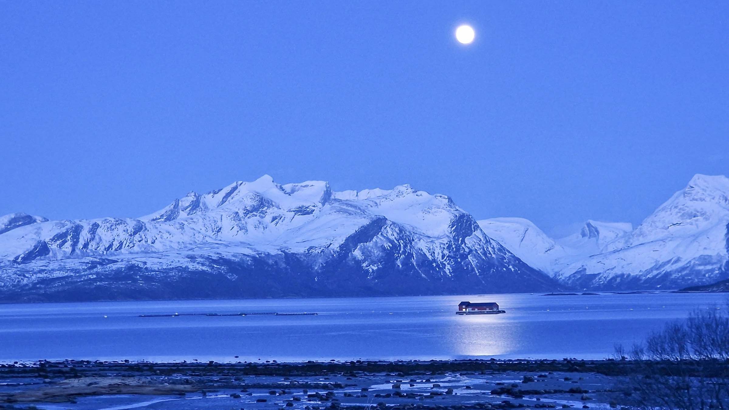 Det finnes mange flotte bilder av oppdrettsanlegg. Knapt noen flottere enn dette. Fullmånen lyser over anlegget Nordfoldleira i Steigen kommune, der Cermaq Norge har hovedkontor og flere av sine lokaliteter i Nordland. (Foto: Cermaq)