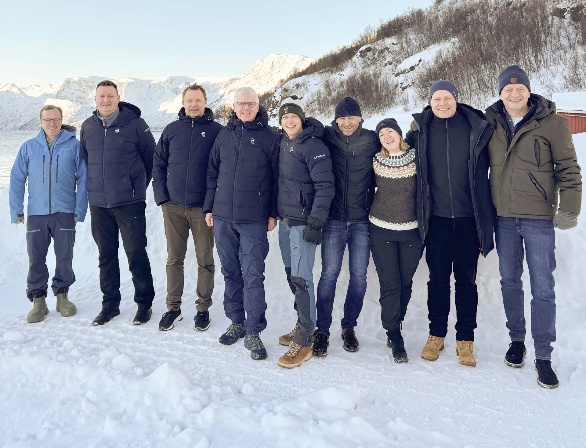 Månedens intervjuobjekt har en særdeles dyktig ledergruppe. Her fra høyre salgsdirektør Brede Løfsgaard, kvalitets- og bærekraftsdirektør Magnus Åsli, sjefen selv — Kristin Hurum, direktør for HR, IT og operasjonell forbedring Rune Halvorsen, direktør for fiskehelse og velferd Karl Fredrik Ottem, regiondirektør Finnmark Gunnar Gudmundsson, regiondirektør Nordland Truls Hansen, finansdirektør John Gunnar Glørstad og leder for Cermaq Norge Salmon AS, Niels Georg Holm. Det sistnevnte selskapet eier alle konsernets lisenser i Norge. (Foto: Cermaq)