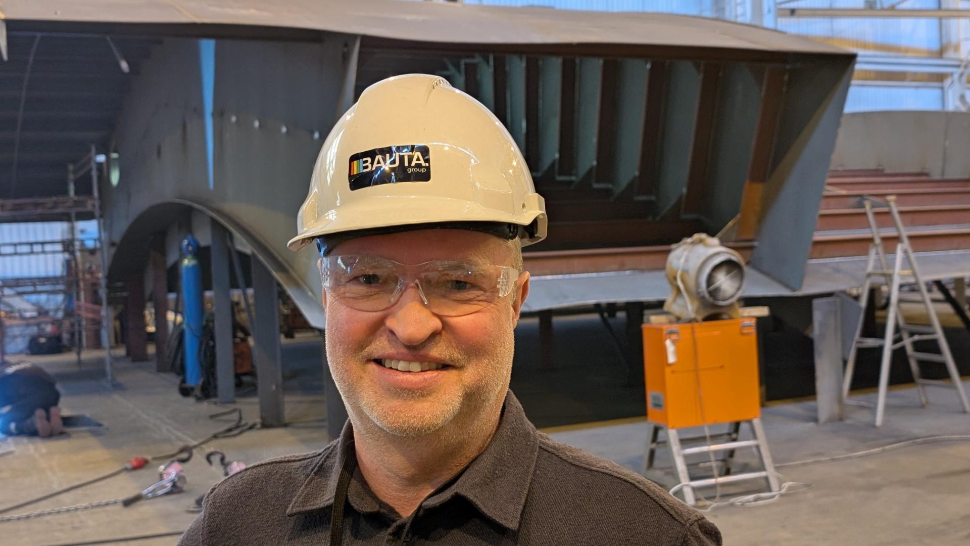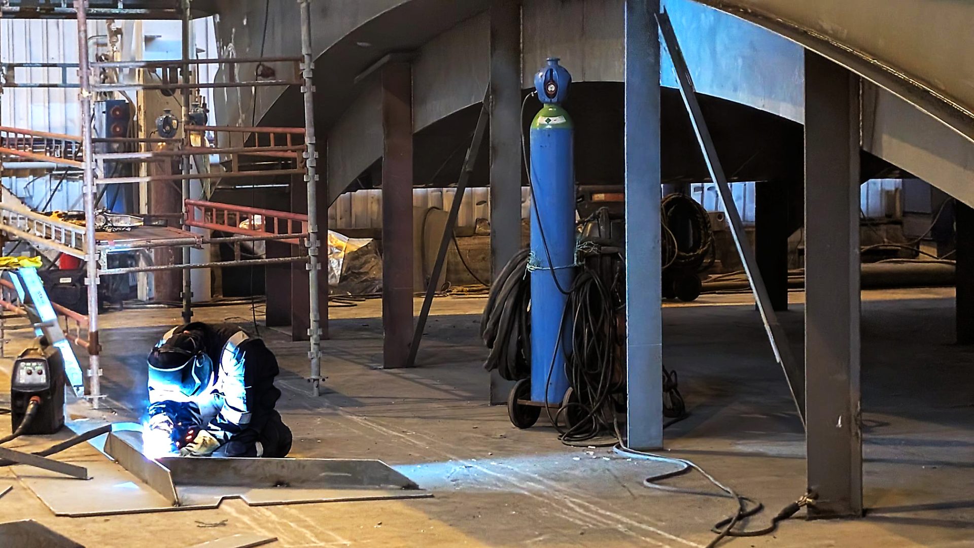 Det virker svært stille på det svære verftsområdet da vi går i land på kaia til Vard Aukra. Men etter å ha fått på hjelm og briller og blitt loset inn i den ene av verkstedhallene, endrer alt seg. Midt i hallen står en veldig konstruksjon i brunt stål. Det lyner i sveiseflammer, skjæres i plater, løftes og monteres.